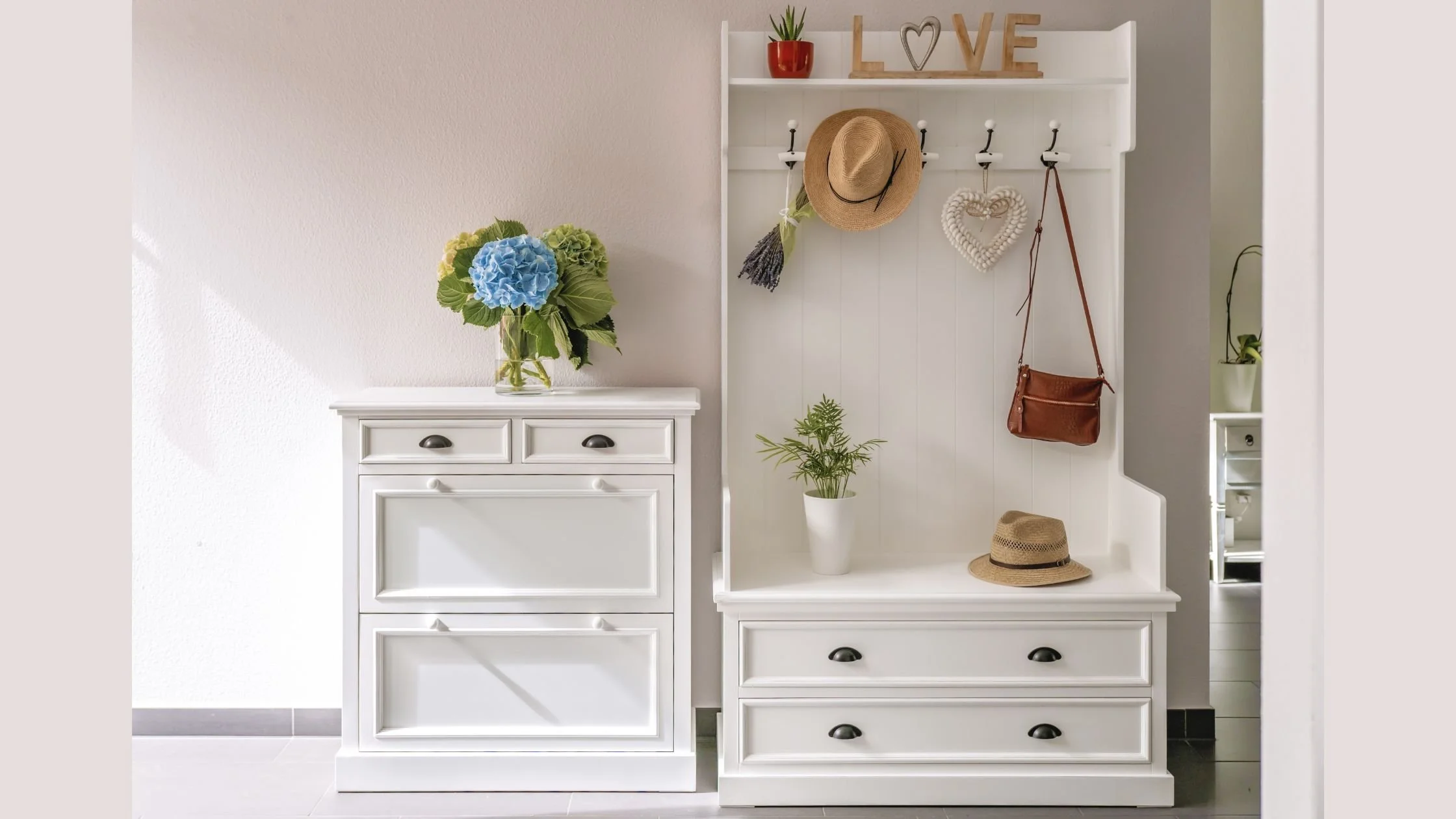 Hooks and wall-mounted organisers keep everyday essentials in sight.