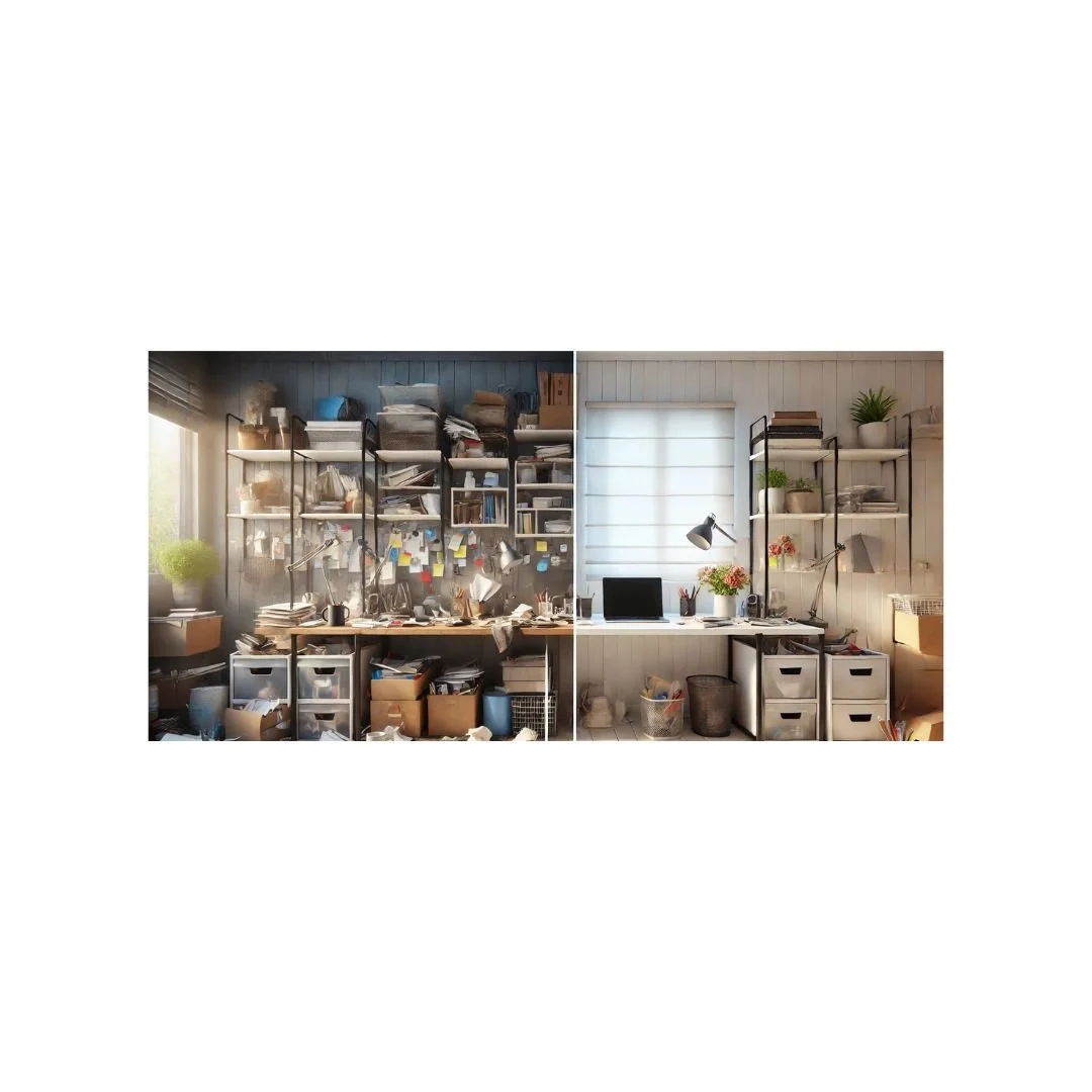 Side-by-side comparison of a cluttered desk with disorganised shelves and a tidy, minimalist workspace, showcasing the transformation from chaos to organisation.